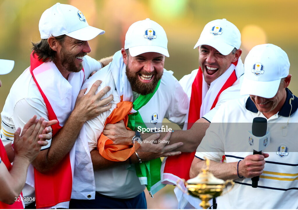 28 September 2025; Europe players, from left, Tommy Fleetwood, Shane Lowry and Rory McIlroy celebrate with the Ryder Cup on day three of the 2025 Ryder Cup at Black Course at Bethpage State Park Golf Course in Farmingdale, New York, USA. Photo by Vaughn Ridley/Sportsfile