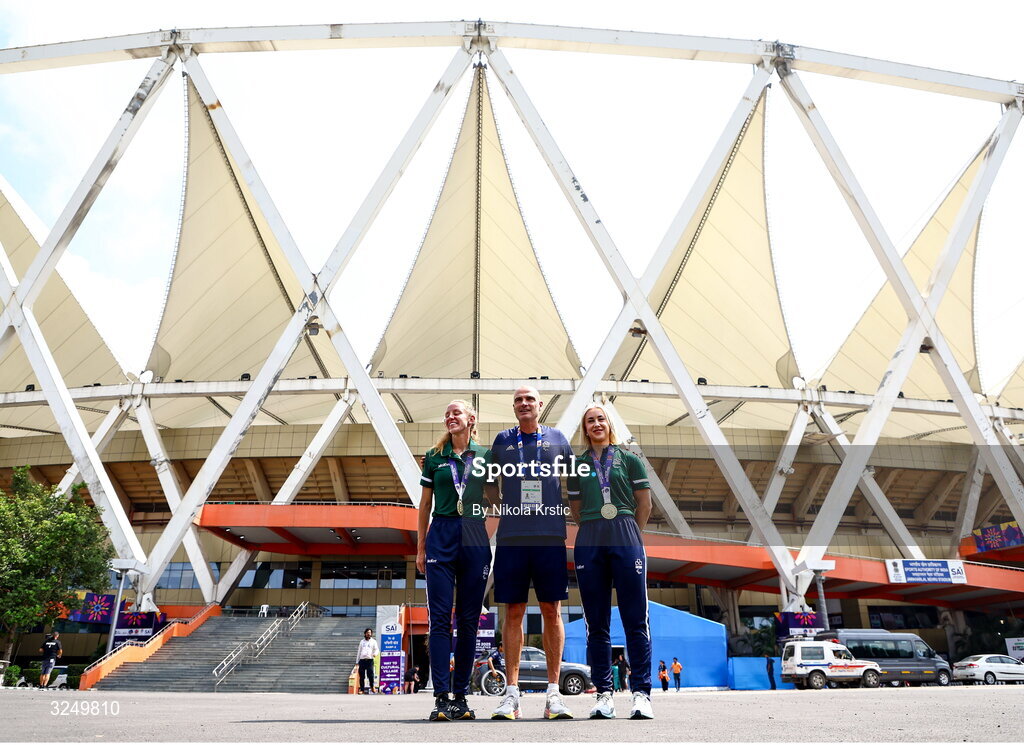 29 September 2025; Greta Streimikyte, left, and Orla Comerford of team Ireland with their Gold medals and Team Leader James Nolan on day four of the New Delhi 2025 World Para Athletics Championships at JLN Stadium in New Delhi, India. Photo by Nikola Krstic/Sportsfile