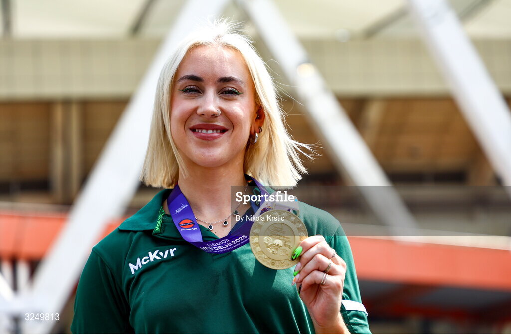 29 September 2025; Orla Comerford of team Ireland with her Gold medal on day four of the New Delhi 2025 World Para Athletics Championships at JLN Stadium in New Delhi, India. Photo by Nikola Krstic/Sportsfile