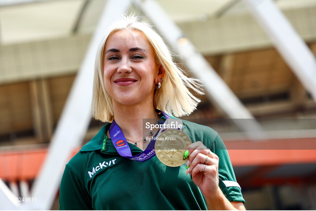 29 September 2025; Orla Comerford of team Ireland with her Gold medal on day four of the New Delhi 2025 World Para Athletics Championships at JLN Stadium in New Delhi, India. Photo by Nikola Krstic/Sportsfile