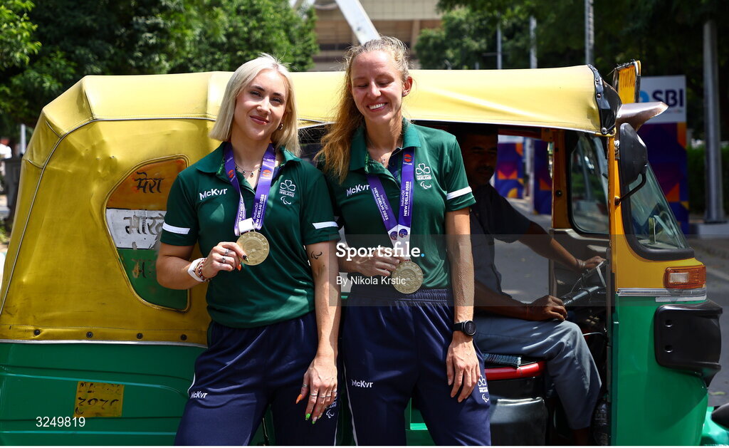 29 September 2025; Orla Comerford, left, and Greta Streimikyte of team Ireland with their Gold medals on day four of the New Delhi 2025 World Para Athletics Championships at JLN Stadium in New Delhi, India. Photo by Nikola Krstic/Sportsfile