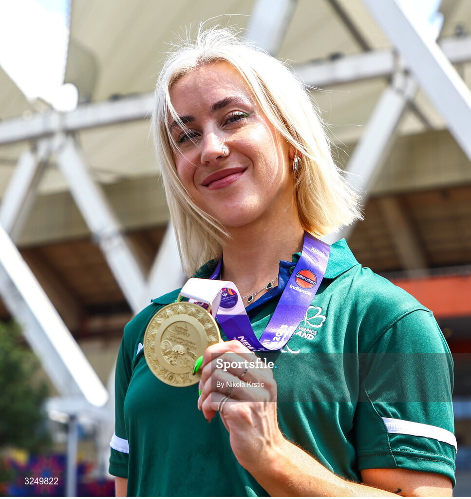 29 September 2025; Orla Comerford of team Ireland with her Gold medal on day four of the New Delhi 2025 World Para Athletics Championships at JLN Stadium in New Delhi, India. Photo by Nikola Krstic/Sportsfile