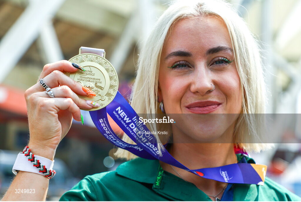 29 September 2025; Orla Comerford of team Ireland with her Gold medal on day four of the New Delhi 2025 World Para Athletics Championships at JLN Stadium in New Delhi, India. Photo by Nikola Krstic/Sportsfile
