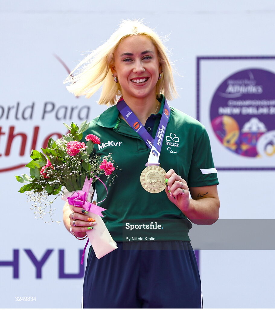 29 September 2025; Orla Comerford of team Ireland with her Gold medal on day four of the New Delhi 2025 World Para Athletics Championships at JLN Stadium in New Delhi, India. Photo by Nikola Krstic/Sportsfile