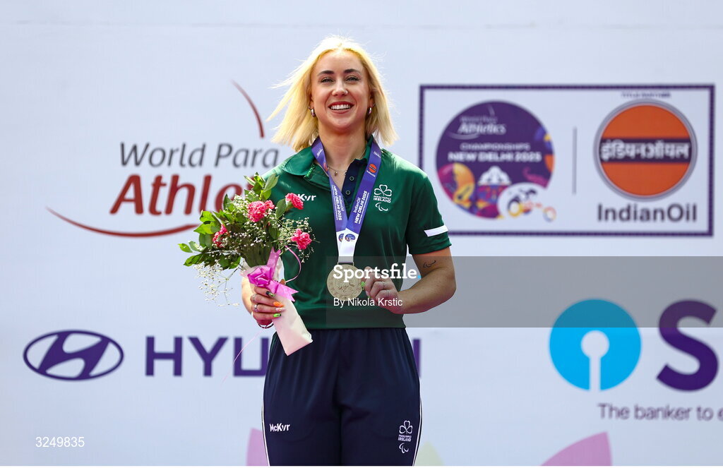 29 September 2025; Orla Comerford of team Ireland with her Gold medal on day four of the New Delhi 2025 World Para Athletics Championships at JLN Stadium in New Delhi, India. Photo by Nikola Krstic/Sportsfile