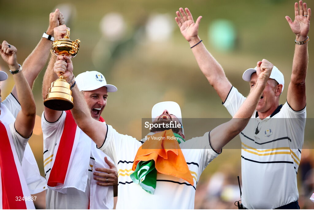 28 September 2025; Shane Lowry of Team Europe lifts the Ryder Cup alongside his teammates on day three of the 2025 Ryder Cup at Black Course at Bethpage State Park Golf Course in Farmingdale, New York, USA. Photo by Vaughn Ridley/Sportsfile
