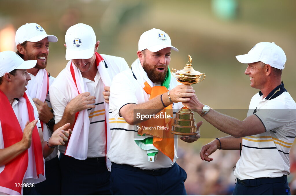 28 September 2025; Europe captain Luke Donald passes the Ryder Cup to Shane Lowry alongside his teammates, from left, Rory McIlroy, Tommy Fleetwood and Justin Rose on day three of the 2025 Ryder Cup at Black Course at Bethpage State Park Golf Course in Farmingdale, New York, USA. Photo by Vaughn Ridley/Sportsfile