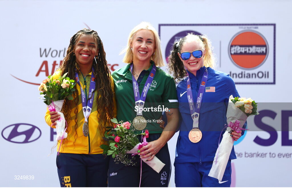 29 September 2025; Orla Comerford of team Ireland, centre, who won Gold, with Soares da Silva of Brazil, left, who won Silver, and Kym Crosby of USA, who won Bronze, in the Women's T13 100m final, on day four of the New Delhi 2025 World Para Athletics Championships at JLN Stadium in New Delhi, India. Photo by Nikola Krstic/Sportsfile