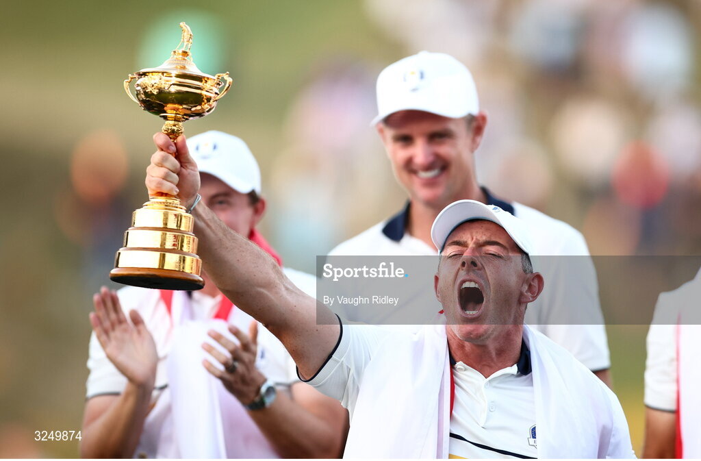 28 September 2025; Rory McIlroy of Team Europe lifts the Ryder Cup on day three of the 2025 Ryder Cup at Black Course at Bethpage State Park Golf Course in Farmingdale, New York, USA. Photo by Vaughn Ridley/Sportsfile