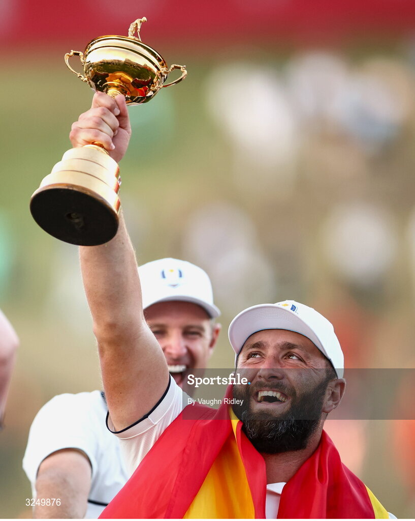 28 September 2025; Jon Rahm of Team Europe lifts the Ryder Cup on day three of the 2025 Ryder Cup at Black Course at Bethpage State Park Golf Course in Farmingdale, New York, USA. Photo by Vaughn Ridley/Sportsfile