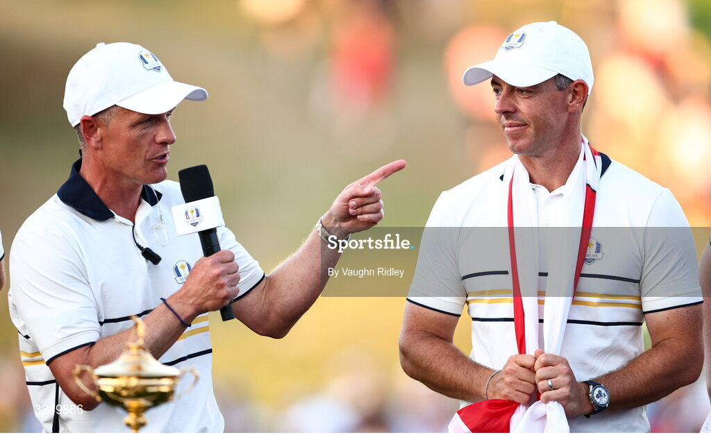28 September 2025; Europe captain Luke Donald, left, and Rory McIlroy of Europe on day three of the 2025 Ryder Cup at Black Course at Bethpage State Park Golf Course in Farmingdale, New York, USA. Photo by Vaughn Ridley/Sportsfile