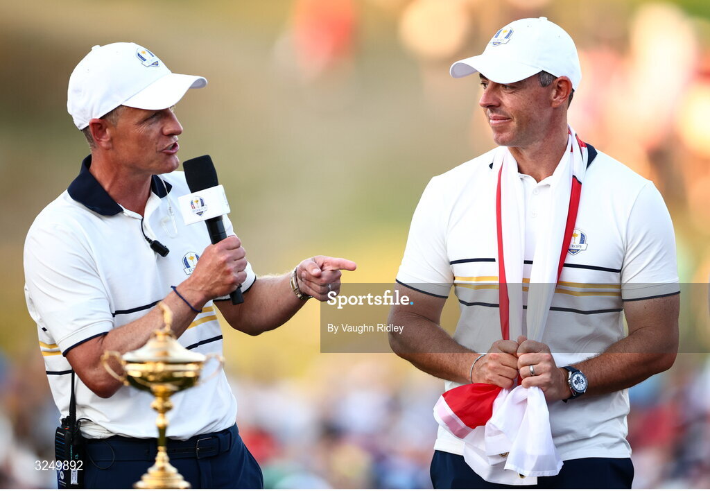 28 September 2025; Europe captain Luke Donald, left, and Rory McIlroy of Europe on day three of the 2025 Ryder Cup at Black Course at Bethpage State Park Golf Course in Farmingdale, New York, USA. Photo by Vaughn Ridley/Sportsfile