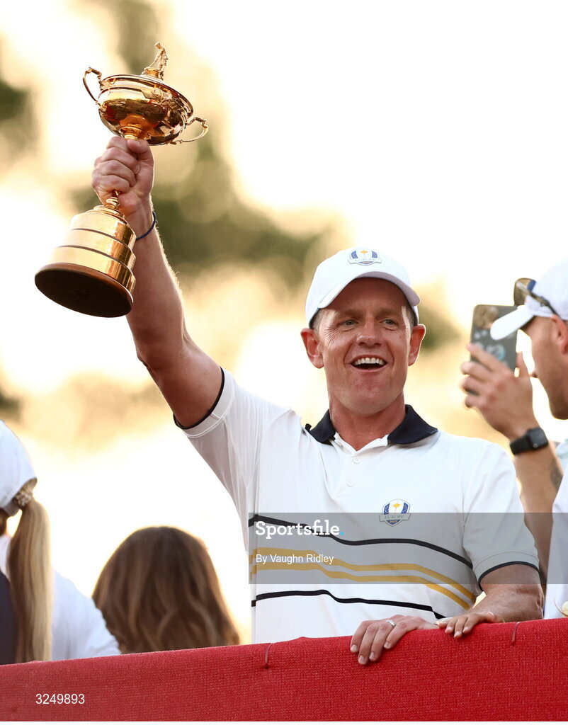 28 September 2025; Europe captain Luke Donald celebrates with the Ryder Cup on day three of the 2025 Ryder Cup at Black Course at Bethpage State Park Golf Course in Farmingdale, New York, USA. Photo by Vaughn Ridley/Sportsfile