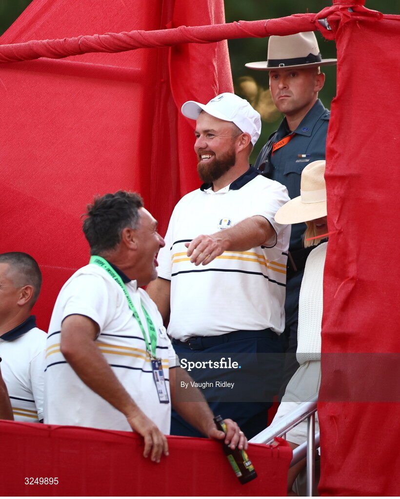 28 September 2025; Shane Lowry of Europe celebrates on day three of the 2025 Ryder Cup at Black Course at Bethpage State Park Golf Course in Farmingdale, New York, USA. Photo by Vaughn Ridley/Sportsfile