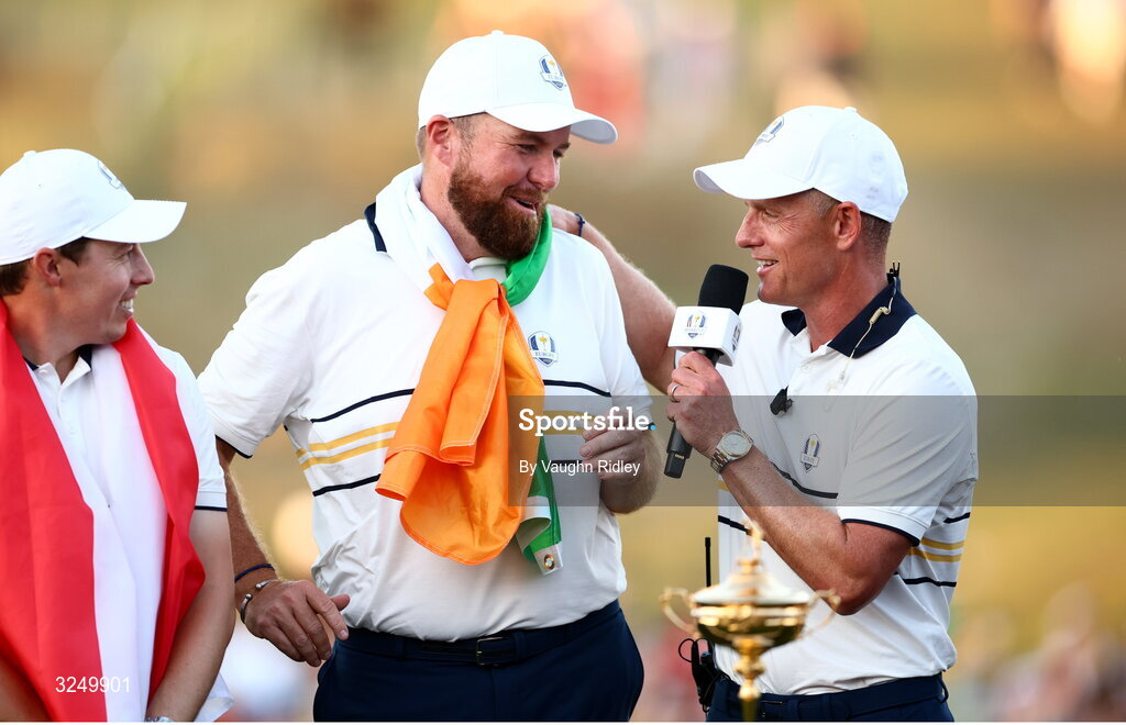 28 September 2025; Europe captain Luke Donald, right, and Shane Lowry of Europe on day three of the 2025 Ryder Cup at Black Course at Bethpage State Park Golf Course in Farmingdale, New York, USA. Photo by Vaughn Ridley/Sportsfile