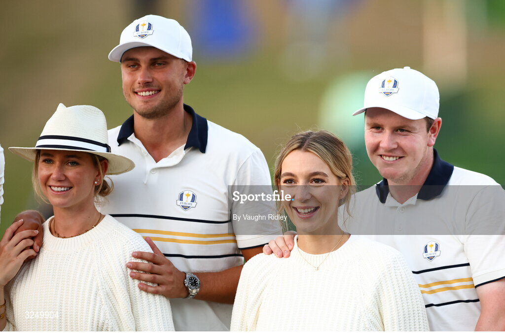 28 September 2025; Celebrating the Europe Ryder cup win, from left, Ludvig Aberg with his partner Olivia Peet and Robert MacIntyre with his partner Shannon Hartley on day three of the 2025 Ryder Cup at Black Course at Bethpage State Park Golf Course in Farmingdale, New York, USA. Photo by Vaughn Ridley/Sportsfile