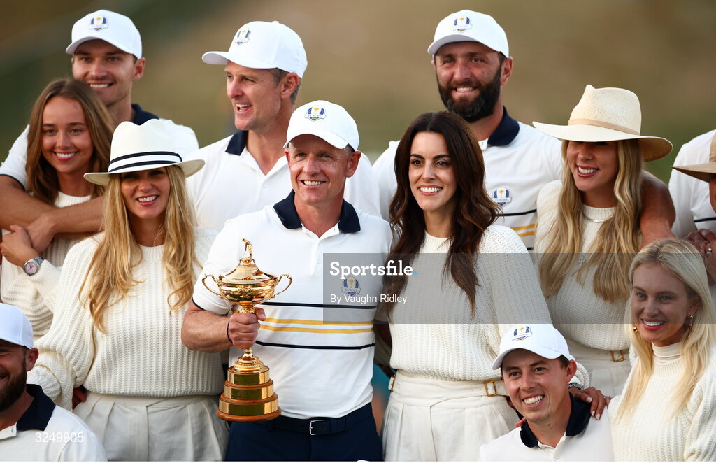 28 September 2025; Celebrating the Europe Ryder cup win, from left, Rasmus Hojgaard with his partner Julie Sander Danielsen and Justin Rose with his wife Kate Rose, Europe captain Luke Donald with his wife Diane Antonopoulos and the Ryder Cup, Jon Rahm with his wife Kelley Rahm and Matt Fitzpatrick with his wife Katherine Fitzpatrick on day three of the 2025 Ryder Cup at Black Course at Bethpage State Park Golf Course in Farmingdale, New York, USA. Photo by Vaughn Ridley/Sportsfile