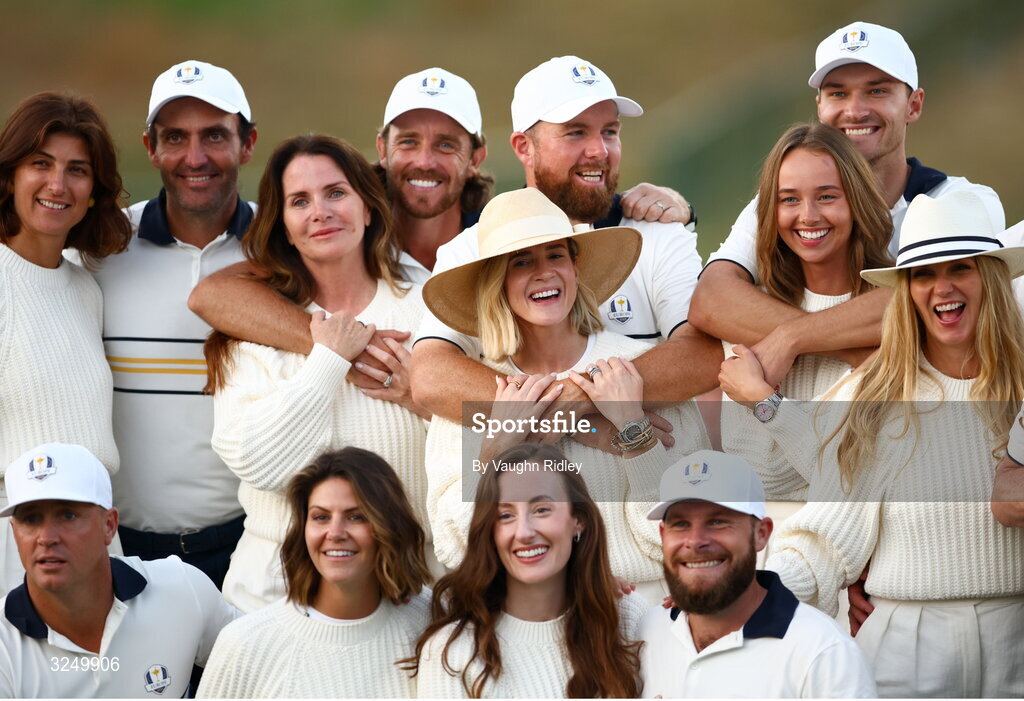 28 September 2025; Celebrating the Europe Ryder cup win, top row, from left, Europe vice-captain Edoardo Molinari with his wife Anna Roscio, Tommy Fleetwood with his wife Clare Fleetwood, Shane Lowry with his wife Wendy Honner, Rasmus Hojgaard with his partner Julie Sander Danielsen and Kate Rose, wife of Justin Rose, not pictured, with bottom row, from left, Europe vice-captain Alex Norén with his wife Jennifer Kovacs and Tyrrell Hatton with his wife Emily Braisher on day three of the 2025 Ryder Cup at Black Course at Bethpage State Park Golf Course in Farmingdale, New York, USA. Photo by Vaughn Ridley/Sportsfile