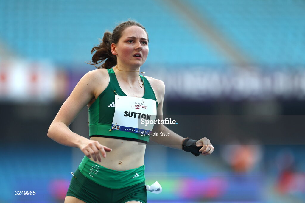 29 September 2025; Lana Sutton of team Ireland competes in the Women's 100m T38 final during day four of the New Delhi 2025 World Para Athletics Championships at JLN Stadium in New Delhi, India. Photo by Nikola Krstic/Sportsfile