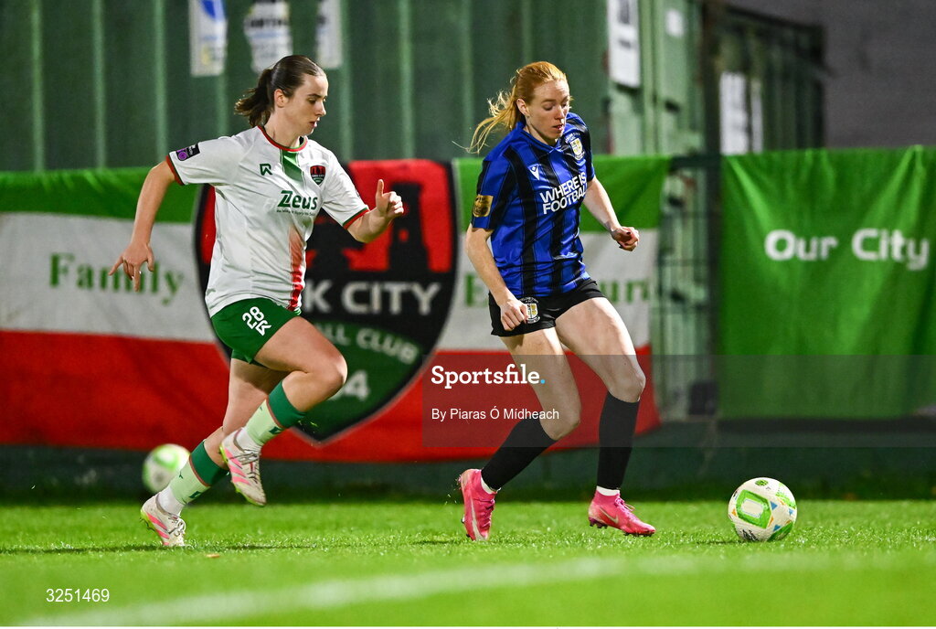 1 October 2025; Kelly Brady of Athlone Town in action against Ciara O'Driscoll of Cork City during the SSE Airtricity Women's Premier Division match between Cork City and Athlone Town at Turner's Cross in Cork. Photo by Piaras Ó Mídheach/Sportsfile