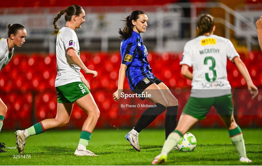 1 October 2025; Kayleigh Shine of Athlone Town scores her side's first goal during the SSE Airtricity Women's Premier Division match between Cork City and Athlone Town at Turner's Cross in Cork. Photo by Piaras Ó Mídheach/Sportsfile