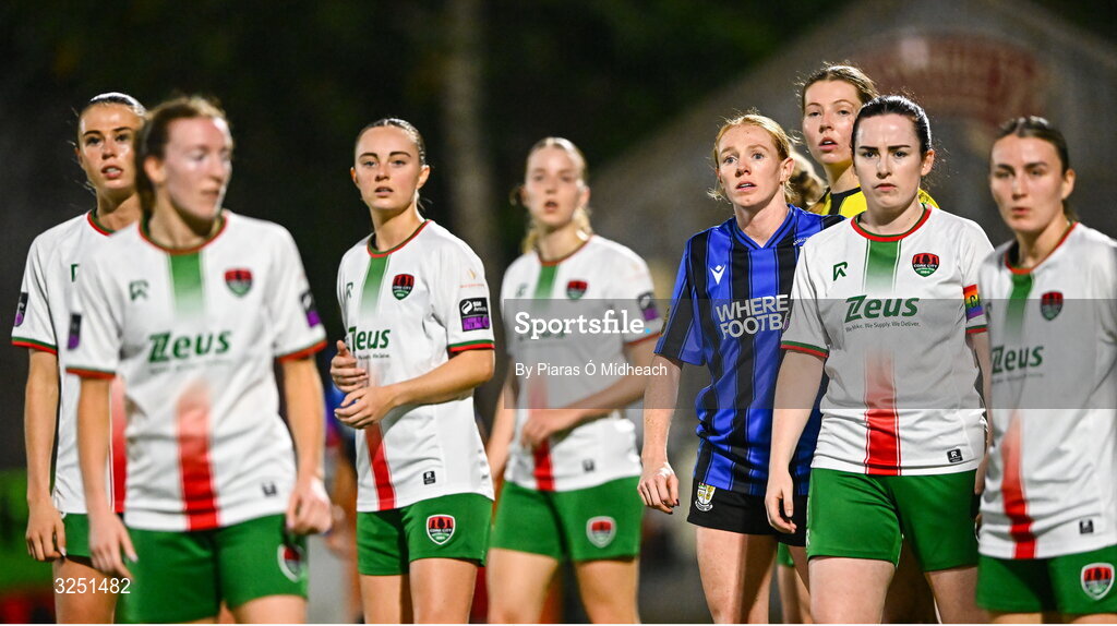 1 October 2025; Kelly Brady of Athlone Town surrounded by Cork City players as she awaits a corner for her side during the SSE Airtricity Women's Premier Division match between Cork City and Athlone Town at Turner's Cross in Cork. Photo by Piaras Ó Mídheach/Sportsfile
