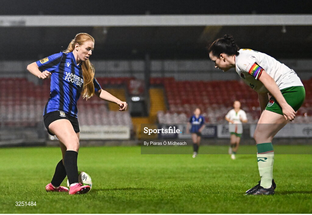 1 October 2025; Kelly Brady of Athlone Town in action against Ciara McNamara of Cork City during the SSE Airtricity Women's Premier Division match between Cork City and Athlone Town at Turner's Cross in Cork. Photo by Piaras Ó Mídheach/Sportsfile