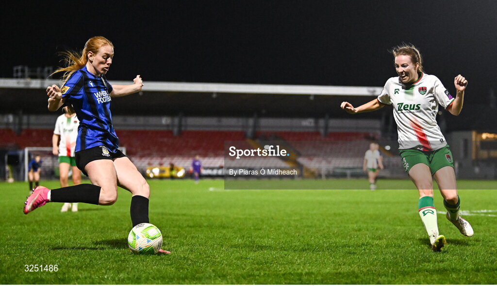 1 October 2025; Kelly Brady of Athlone Town in action against Shaunagh McCarthy of Cork City during the SSE Airtricity Women's Premier Division match between Cork City and Athlone Town at Turner's Cross in Cork. Photo by Piaras Ó Mídheach/Sportsfile