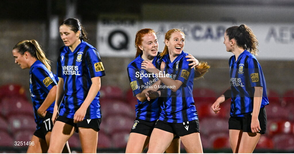 1 October 2025; Kelly Brady of Athlone Town, second from right, celebrates with team-mates Kellie Brennan, right, and Kate Slevin after scoring their side's third goal during the SSE Airtricity Women's Premier Division match between Cork City and Athlone Town at Turner's Cross in Cork. Photo by Piaras Ó Mídheach/Sportsfile