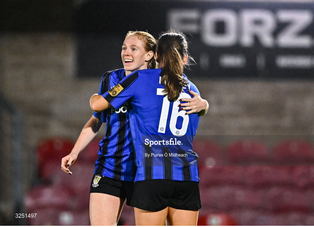 1 October 2025; Kelly Brady of Athlone Town celebrates with team-mate Emma Mooney, 16, after scoring their side's third goal during the SSE Airtricity Women's Premier Division match between Cork City and Athlone Town at Turner's Cross in Cork. Photo by Piaras Ó Mídheach/Sportsfile