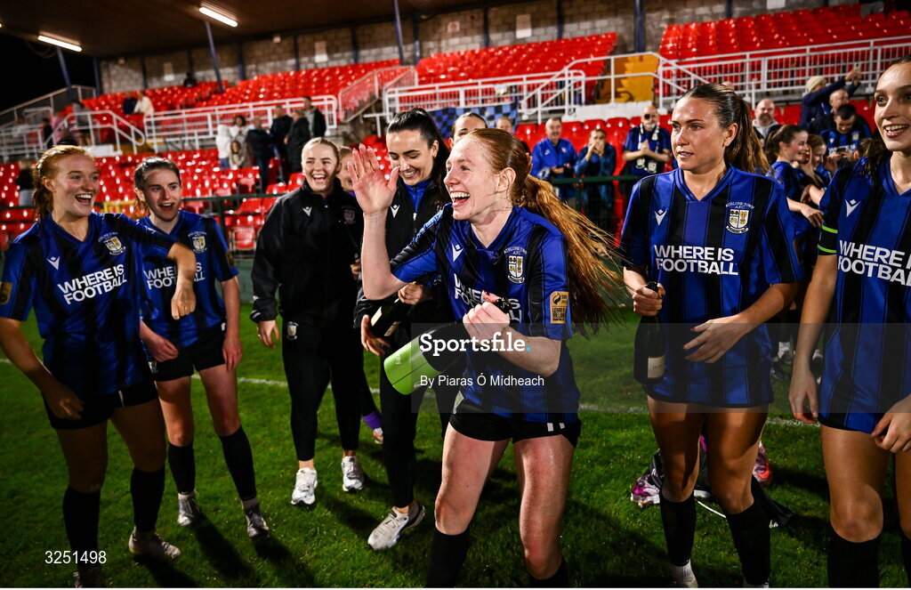 1 October 2025; Athlone Town players and staff, led by Kelly Brady, centre, celebrate winning the league title after victory in the SSE Airtricity Women's Premier Division match between Cork City and Athlone Town at Turner's Cross in Cork. Photo by Piaras Ó Mídheach/Sportsfile