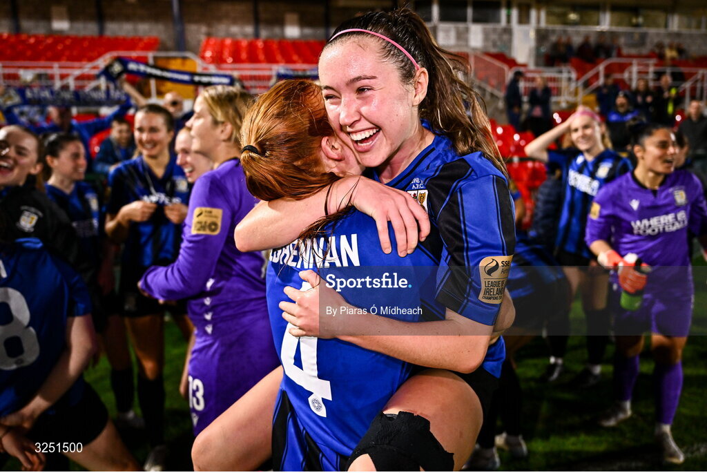 1 October 2025; Hannah Waesch, right, and Shauna Brennan of Athlone Town celebrate winning the league title after victory in the SSE Airtricity Women's Premier Division match between Cork City and Athlone Town at Turner's Cross in Cork. Photo by Piaras Ó Mídheach/Sportsfile