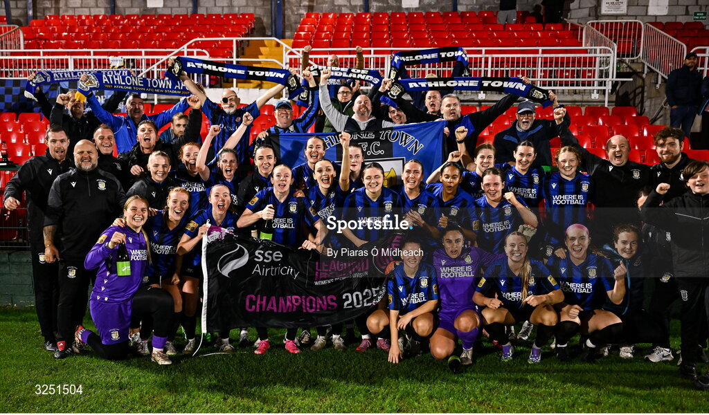 1 October 2025; Athlone Town players and staff celebrate winning the league title after victory in the SSE Airtricity Women's Premier Division match between Cork City and Athlone Town at Turner's Cross in Cork. Photo by Piaras Ó Mídheach/Sportsfile