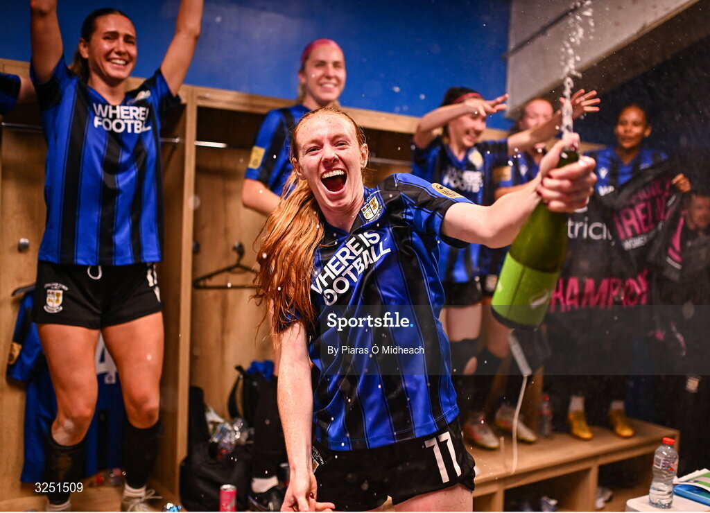 1 October 2025; Athlone Town players, led by Kelly Brady, centre, celebrate winning the league title after victory in the SSE Airtricity Women's Premier Division match between Cork City and Athlone Town at Turner's Cross in Cork. Photo by Piaras Ó Mídheach/Sportsfile