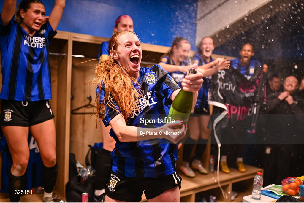 1 October 2025; Athlone Town players, led by Kelly Brady, centre, celebrate winning the league title after victory in the SSE Airtricity Women's Premier Division match between Cork City and Athlone Town at Turner's Cross in Cork. Photo by Piaras Ó Mídheach/Sportsfile