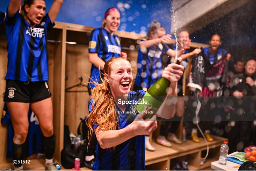 1 October 2025; Athlone Town players, led by Kelly Brady, centre, celebrate winning the league title after victory in the SSE Airtricity Women's Premier Division match between Cork City and Athlone Town at Turner's Cross in Cork. Photo by Piaras Ó Mídheach/Sportsfile
