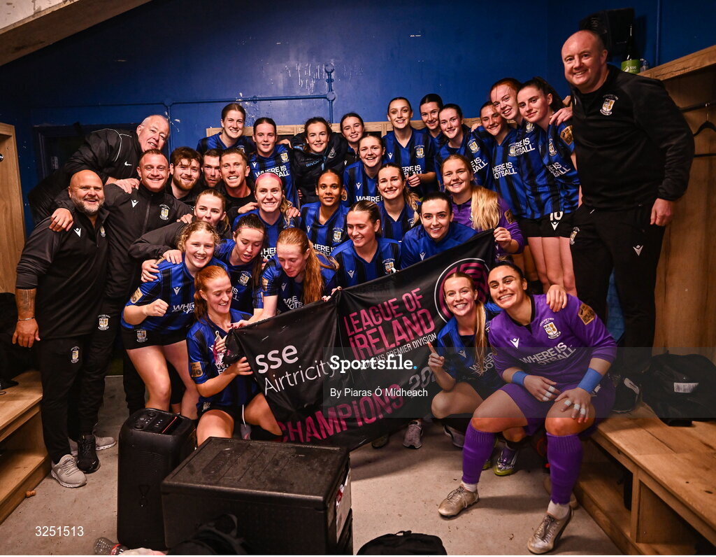 1 October 2025; Athlone Town players and staff celebrate winning the league title after victory in the SSE Airtricity Women's Premier Division match between Cork City and Athlone Town at Turner's Cross in Cork. Photo by Piaras Ó Mídheach/Sportsfile