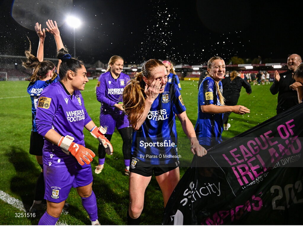 1 October 2025; Goalkeeper Maria Matthaiou, left, and Kelly Brady of Athlone Town celebrate winning the league title after victory in the SSE Airtricity Women's Premier Division match between Cork City and Athlone Town at Turner's Cross in Cork. Photo by Piaras Ó Mídheach/Sportsfile