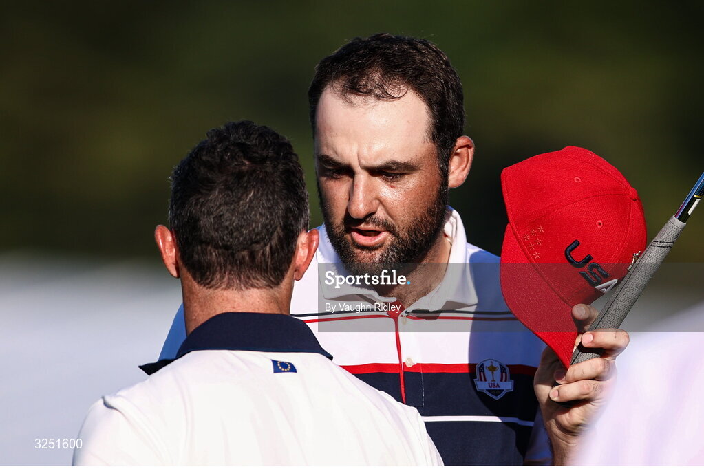 28 September 2025; Scottie Scheffler of USA, right, and Rory McIlroy of Europe during the singles matches on day three of the 2025 Ryder Cup at Black Course at Bethpage State Park Golf Course in Farmingdale, New York, USA. Photo by Vaughn Ridley/Sportsfile
