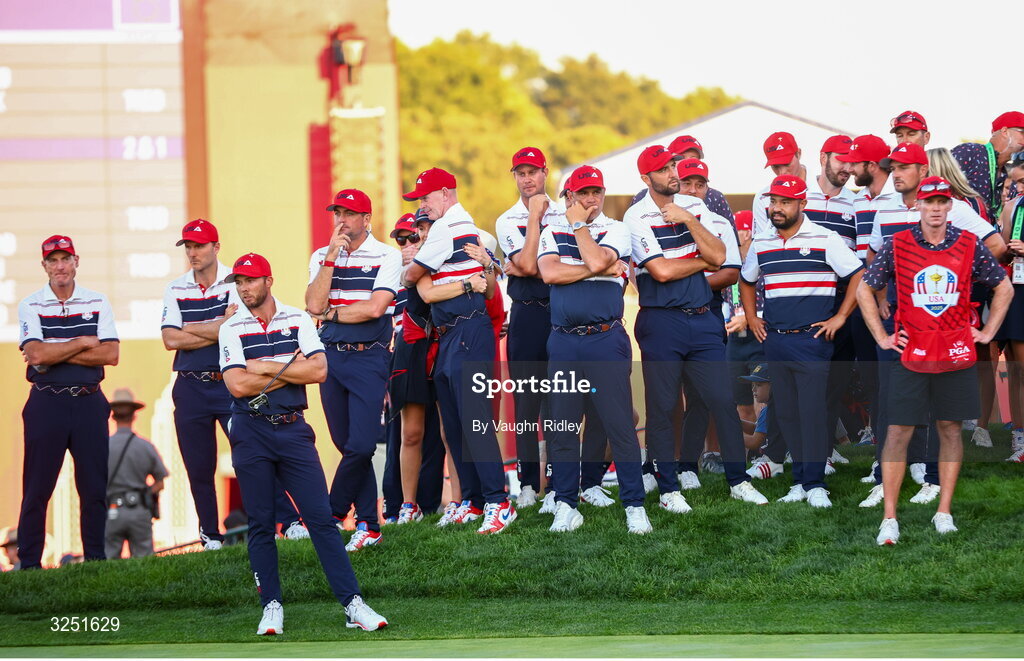 28 September 2025; USA players and backroom staff, including Sam Burns, captain Keegan Bradley, Scottie Scheffler and JJ Spaun, after the singles matches on day three of the 2025 Ryder Cup at Black Course at Bethpage State Park Golf Course in Farmingdale, New York, USA. Photo by Vaughn Ridley/Sportsfile