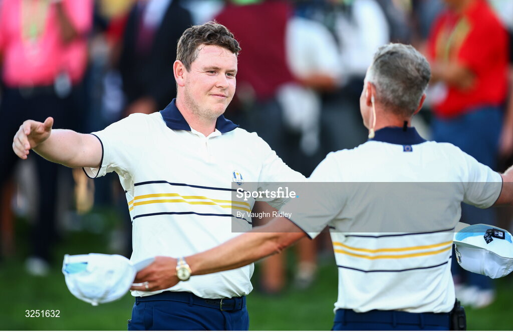 28 September 2025; Robert MacIntyre of Europe, left, and Europe captain Luke Donald after the singles matches on day three of the 2025 Ryder Cup at Black Course at Bethpage State Park Golf Course in Farmingdale, New York, USA. Photo by Vaughn Ridley/Sportsfile