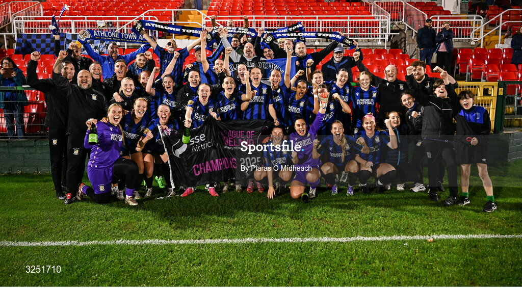 1 October 2025; The Athlone Town squad celebrate winning the league title after victory in the SSE Airtricity Women's Premier Division match between Cork City and Athlone Town at Turner's Cross in Cork. Photo by Piaras Ó Mídheach/Sportsfile