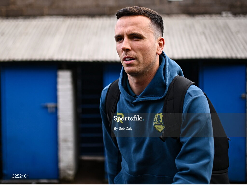3 October 2025; Charlie Lyons of Cork City arrives before the Sports Direct Men’s FAI Cup semi-final match between Cork City and St Patrick's Athletic at Turner’s Cross in Cork. Photo by Seb Daly/Sportsfile