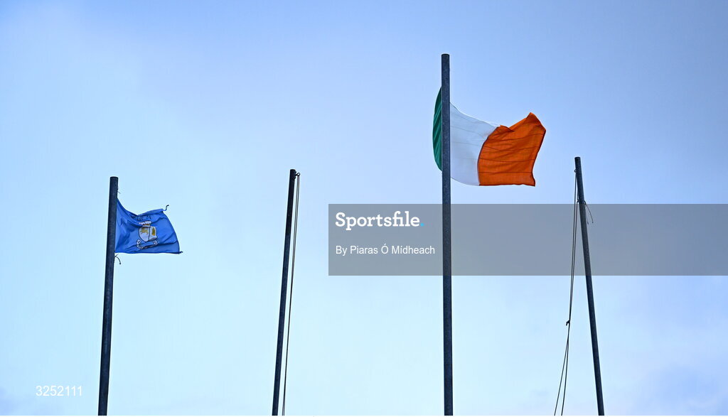 3 October 2025; The Athlone flag and the Irish Tricolour flying in strong wind before the SSE Airtricity Men's First Division match between Athlone Town and Dundalk at Athlone Town Stadium in Westmeath. Photo by Piaras Ó Mídheach/Sportsfile