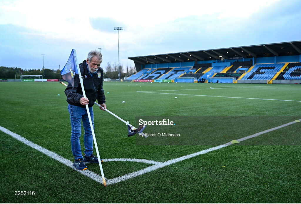 3 October 2025; Groundsman John West places a corner flag before the SSE Airtricity Men's First Division match between Athlone Town and Dundalk at Athlone Town Stadium in Westmeath. Photo by Piaras Ó Mídheach/Sportsfile