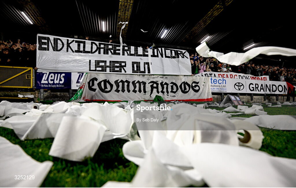 3 October 2025; A general view of toilet rolls on the pitch as Cork City supporters protest before the Sports Direct Men’s FAI Cup semi-final match between Cork City and St Patrick's Athletic at Turner’s Cross in Cork. Photo by Seb Daly/Sportsfile
