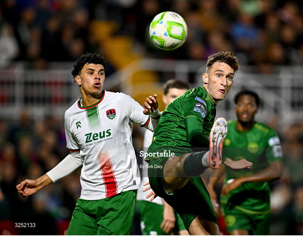 3 October 2025; Mason Melia of St Patrick's Athletic in action against Freddie Anderson of Cork City during the Sports Direct Men’s FAI Cup semi-final match between Cork City and St Patrick's Athletic at Turner’s Cross in Cork. Photo by Seb Daly/Sportsfile