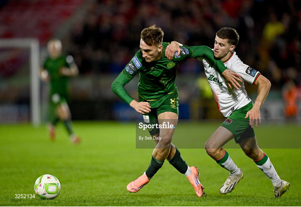 3 October 2025; Mason Melia of St Patrick's Athletic in action against Darragh Crowley of Cork City during the Sports Direct Men’s FAI Cup semi-final match between Cork City and St Patrick's Athletic at Turner’s Cross in Cork. Photo by Seb Daly/Sportsfile