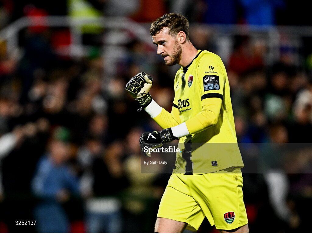 3 October 2025; Cork City goalkeeper Conor Brann celebrates his side's first goal, scored by Sean Maguire during the Sports Direct Men’s FAI Cup semi-final match between Cork City and St Patrick's Athletic at Turner’s Cross in Cork. Photo by Seb Daly/Sportsfile