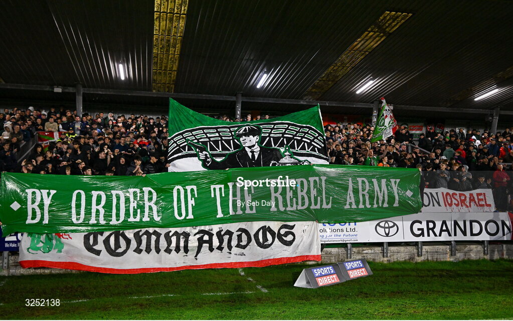3 October 2025; Cork City supporters display banners before the Sports Direct Men’s FAI Cup semi-final match between Cork City and St Patrick's Athletic at Turner’s Cross in Cork. Photo by Seb Daly/Sportsfile